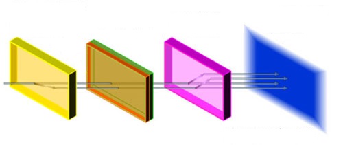 L'OLPF è formato in genere da due piastre birifrangenti e da una piastra per la lunghezza d'onda. La luce viene suddivisa nella fase di trasmissione, attraverso le piastre birifrangenti, al sensore di immagine, come mostrato di seguito. Inoltre, anche il rivestimento IR e AR, nonché il vetro di assorbimento IR vengono utilizzati per garantire una migliore riproduzione dei colori.