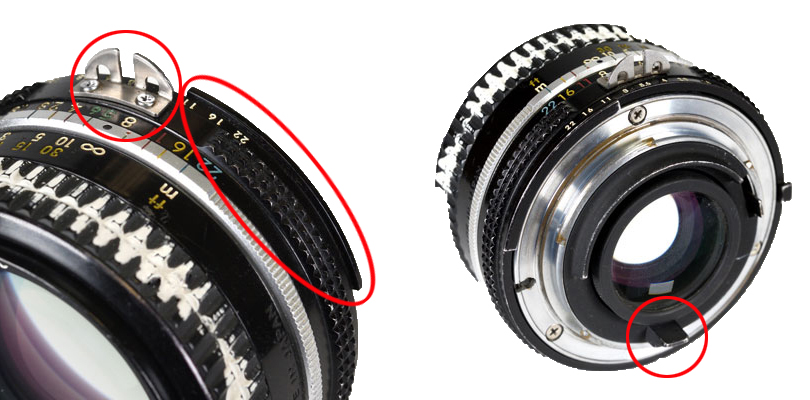 L'innesto dell'obiettivo è praticamente uguale a quello dell'obiettivo AI, tranne per la presenza della protezione nell'innesto a baionetta in metallo, come mostrato sopra. L'obiettivo AI-S è stato creato in concomitanza con le modifiche apportate al meccanismo dell'apertura degli obiettivi AI per consentire il controllo automatico del diaframma con le fotocamere come, ad esempio, la FA. Grazie a questa modifica, la fotocamera è in grado di controllare gli incrementi di apertura dell'obiettivo AI-S con maggior precisione.