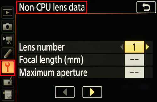Questi obiettivi meno recenti sono senza CPU, ovvero non è presente alcuna comunicazione elettrica fra l'obiettivo e la fotocamera. Tuttavia, le ultime fotocamere SLR digitali Nikon ti consentono di aggiungere manualmente i dati dell'obiettivo senza CPU nel menu della fotocamera in modo che quest'ultima riconosca quale obiettivo è stato montato e di conseguenza effettui la misurazione e imposti il flash. Per ogni obiettivo, immetti la lunghezza focale (mm) e l'apertura massima con il numero di obiettivo dal momento che è possibile registrare fino a 9 obiettivi. Tutte le volte che cambi l'obiettivo, dovrai selezionarlo dal menu.