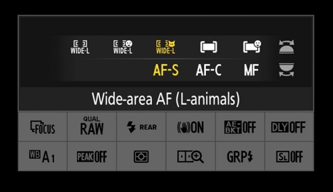 | Wide-area AF (S) (AF s širokim območjem) (S) | • AF-S, AF-C • Uporabite za nepremične ali premikajoče se motive, ki jih je težko kadrirati z eno točko • Če izbrano območje ostrenja vsebuje motive, ki so različno oddaljeni od fotoaparata, bo fotoaparat dal prednost najbližjemu motivu • Med snemanjem videoposnetka je AF s širokim območjem uporabno za ohranjanje ostrine premikajočih se motivov • Območje, ki ga pokriva AF s širokim območjem (L) je večje • Če je izbran AF s širokim območjem (L‑ljudje), fotoaparat zazna in izostri obraze ali oči človeških portretnih motivov v aktivnem območju ostrenja. • Če je izbran AF s širokim območjem (L‑živali), fotoaparat zazna in izostri obraze ali oči mačkov in psov v aktivnem območju ostrenja |