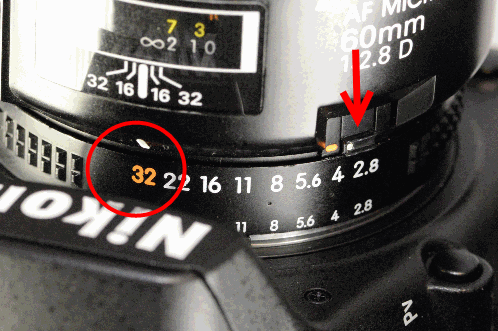 2. Nastavte clonu na F22 případně na jiné nejvyšší clonové číslo daného objektivu, které je obvykle vyznačené oranžově. Všimněte si aretace clonového kroužku.