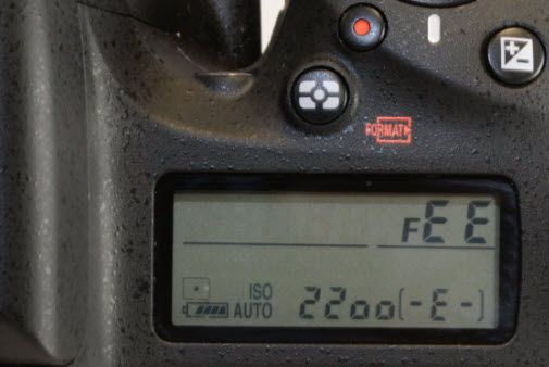 Hvis det står "FEE" der blenderåpningen vanligvis vises på speilreflekskameraets LCD-skjerm, kontrollerer du at objektivet er riktig festet til kameraet. Denne feilmeldingen vises hvis objektivet ikke er riktig festet riktig til kameraet eller hvis du ikke bruker et CPU-objektiv, som for eksempel NIKKOR AF eller NIKKOR P.